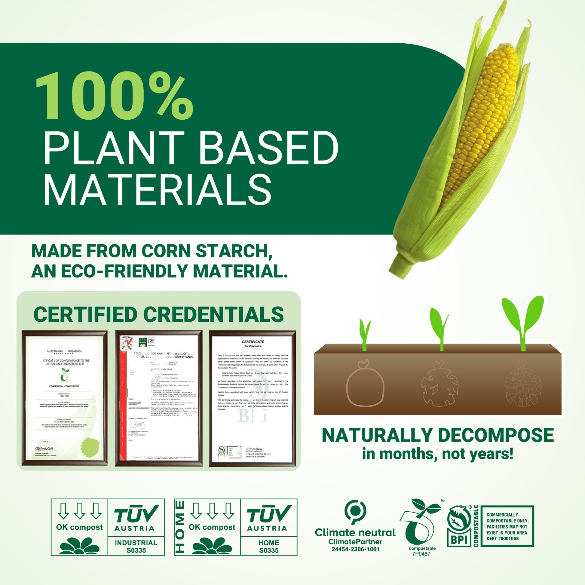 - 🌱 CERTIFIED COMPOSTABLE IN EUROPE & U.S: Certified by the Biodegradable Products Institute (BPI) under US standard ASTM D6400. Certified OK Compost Home under European standard EN 13432 by Vinçotte and Tüv Austria. OK Compost Home certification guarantees 100% BIODEGRADABILITY IN HOME COMPOSTING facilities. No plastics will enter the soil!