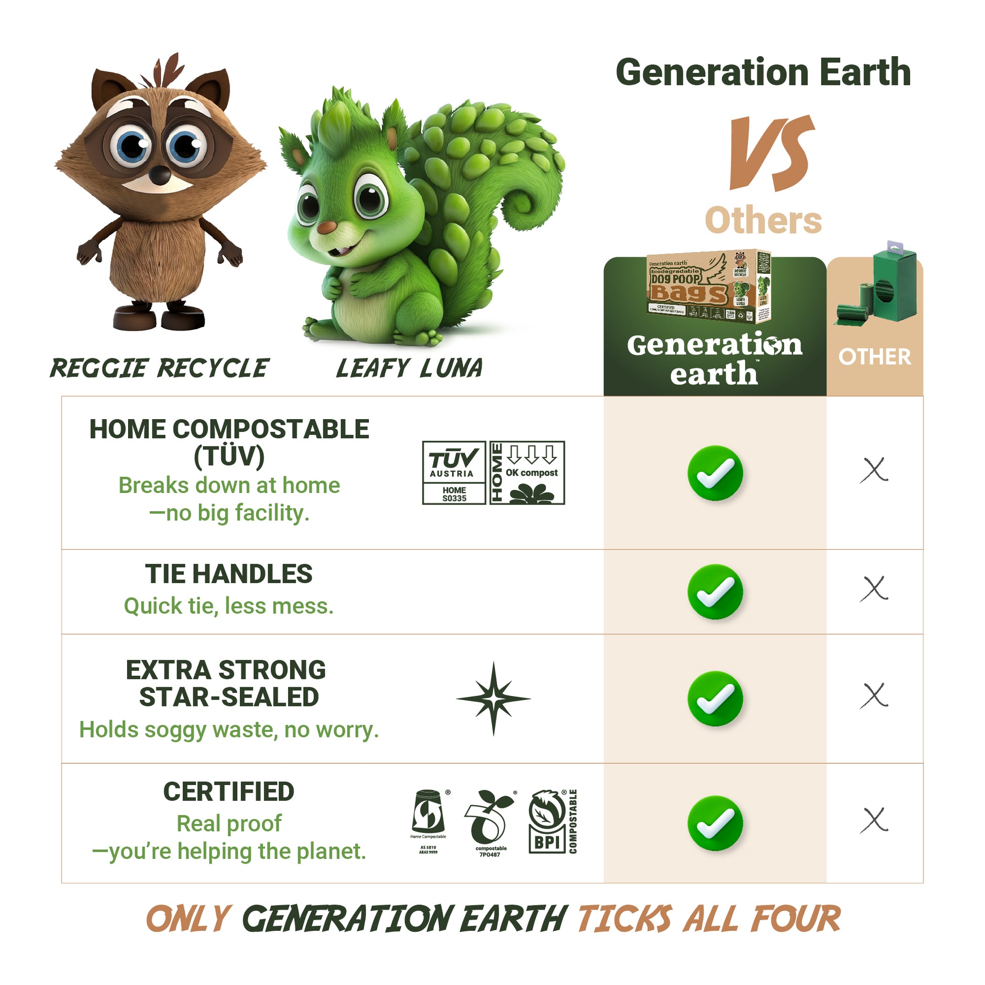 - 🌎 Generation earth compostable bags are the ethical choice for a cleaner environment and an ECO-FRIENDLY future. Thank you taking care of our planet for FUTURE GENERATIONS by replacing plastic with our sustainably manufactured, compostable bags.